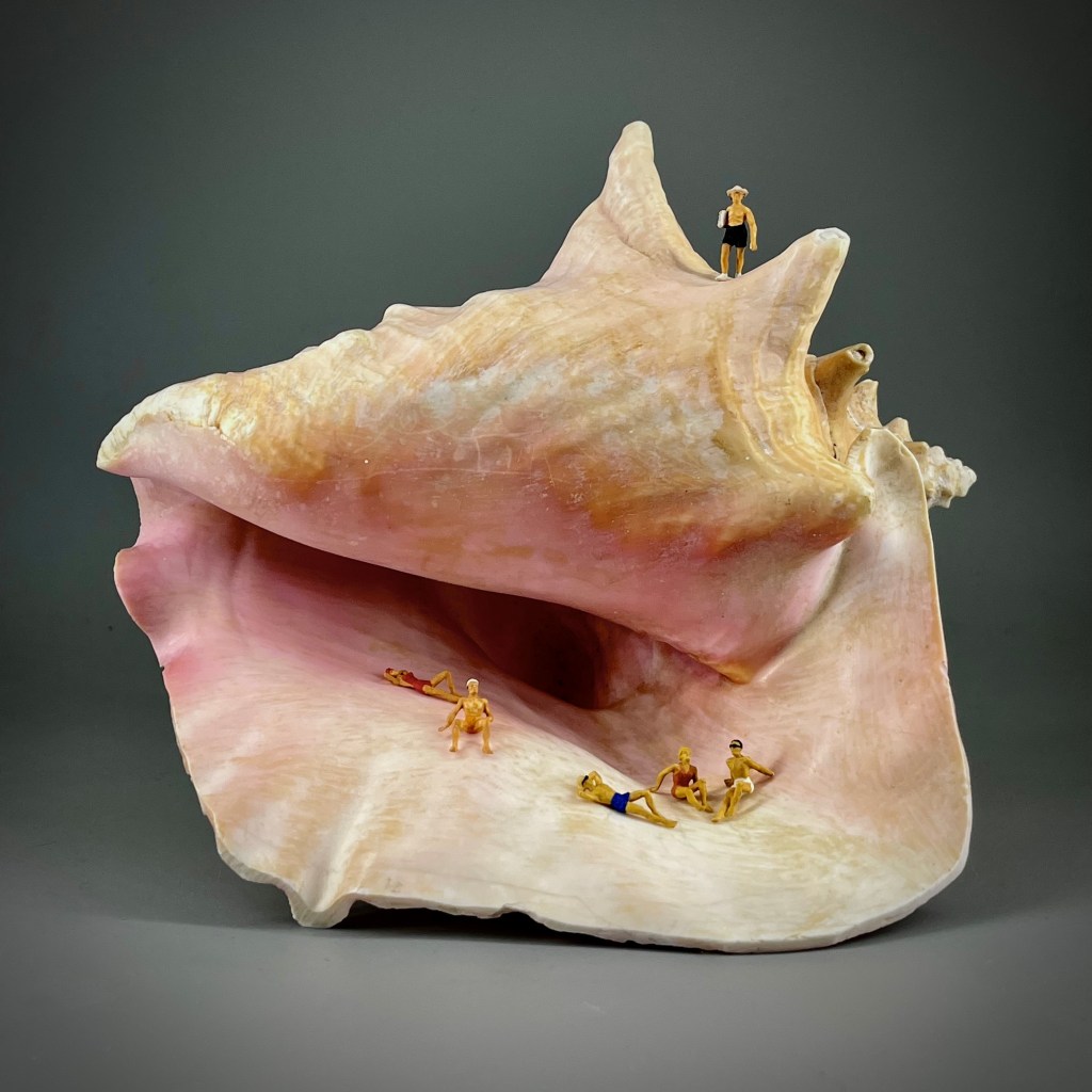At dawn the swimmers arrive; it’s 10am and the man rolls along the tide line as a group start digging holes with their equipment; over lunch, a couple describe what they have seen in the distance, crab claws waving, snapping and gesturing. By 3pm the water recedes to reveal a secret on the seabed, the lifeguards wait and the family sleeps. Who’s shouting? Who knows what’s going on? Birds drift, the boat station is poised. More swimmers arrive for a late bout, they stand still; someone says “It’s going to be a high, high tide”.